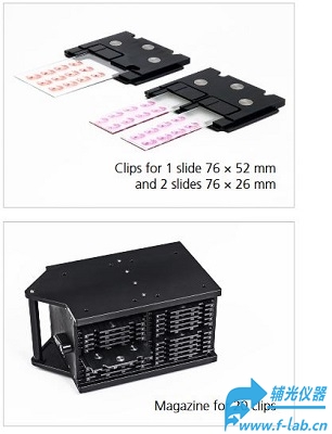 容量1:120个载玻片,76x26x1mm在3个载玻片架中,每个载玻片架可容纳20个载玻片夹,每个载玻片夹可容纳2个载玻片