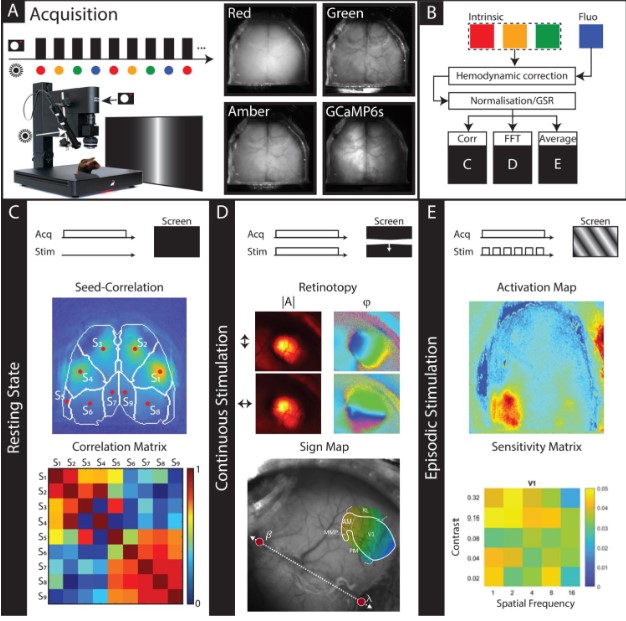对于钙成像,内源信号光学显微镜使用基于LED的照明以获得两种钙以及固有信号。这些信号是然后用于获得钙信号(ΔF/F,%)。在示例中